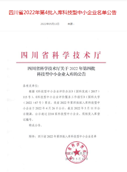 近日,四川藍鼎新材料有限公司順利通過2022年四川省第4批國家科技型中小企業(yè)認定。